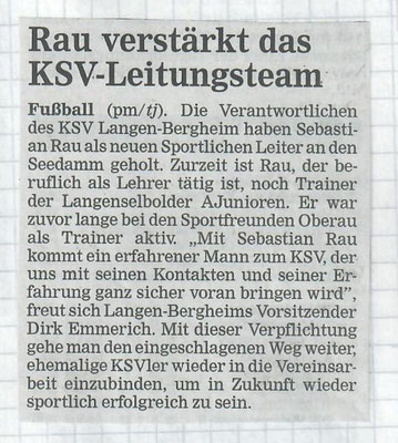 Nach langjährigem Wirken wird der bisherige Trainer der zweiten Langenbergheimer Garnitur Thomas Rotter von seinem Posten zurücktreten. Gerade in Zeiten sportlicher Talfahrt half Thomas Rotter durch sein großes Engagement den Spielbetrieb beider Mannschaften aufrecht zu erhalten. Dieses Jahr konnte er die neu formierte zweite Mannschaft des KSVs auf einem Mittelfeldplatz in der Kreisliga C etablieren. Die Vereinsverantwortlichen danken für seine lange und engagierte Tätigkeit und wünschen viel Glück bei seinem weiteren Weg. Zur kommenden Saison 2016/17 wird mit Sascha Quillmann ein bisheriger Spieler der ersten Mannschaft als Spielertrainer fungiere. Bei der Suche nach einem neuen Coach präferierten die Verantwortlichen bewusst einen Vertreter aus den eigenen Reihen, der sich mit der Philosophie des Vereins auf junge und einheimische Spieler zu setzen voll identifizieren kann und diese unterstützen und fortsetzen wird.